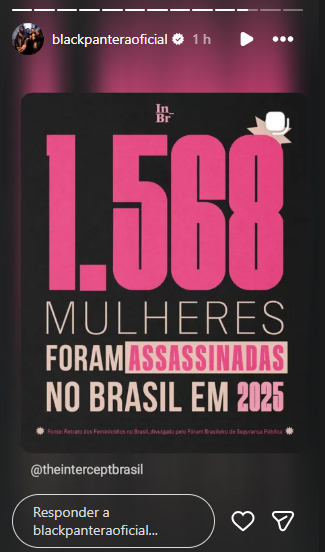 E quem sempre esteve na luta a favor das mulheres é o grupo mineiro Black Pantera. Por meio de story, o trio – Charles Gama (voz e guitarra), Chaene da Gama (voz e baixo) e Rodrigo Pancho (bateria) – compartilhou o triste dado de feminicídios em nosso país.