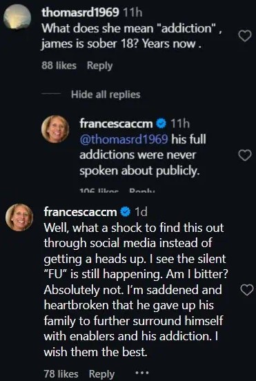Francesca Tomasi volta atacar James Hetfield afirmando que rock star tem muitos vícios